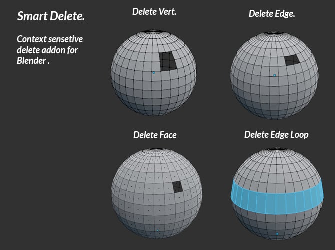 Smart delete combines all types of delete to one button in Blender so that you don't have to browse through a list to manually choose the correct delete option for what you are trying to delete.
